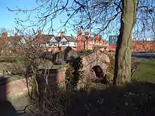 The bridge was built with sandstone in 1894 for Lever Brothers in their model village of Port Sunlight and was designed by the Chester architects' firm of Douglas and Fordham. It carries a pedestrian walkway over a landscaped hollow which had been formed from a former tidal inlet.[2] It is a saddle-back bridge with a parabolic arch.[3] The keystones are carved with masks, one of a Jacobean man, the other of a Restoration man. Above these are plaques, that to the east, bears an inscription; that to the west a sundial. The bridge is supported by buttresses, and at each end is a canted projection with decorative panels. There are hard wood benches by the walkway.[1] Originally there were ball finials on the bridge, but these are no longer present.[2]