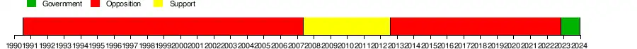 Year Leader Popular vote  % of popular vote # # of seats Seat change Coalition Status