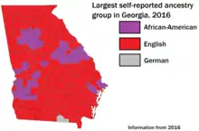 According to data from 2010, the largest ancestry groups were: 10.8% American (mostly British descent), 9.5% Irish, 8.9% English, 8.8% Hispanics and Latinos and 8.2% German.[7] In the 1980 census, 1,584,303 Georgians cited that they were of English ancestry out of a total state population of 3,994,817 making them 40% of the state, and the largest ethnic group at the time.[8] Their ancestry primarily goes back to the original Thirteen Colonies and for this reason many of them today simply claim "American" ancestry, though they are of predominantly English ancestry.[9][10][11][12]