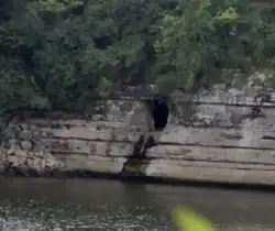 There is a large crack in the facade along the Cumberland River which is named for fur trapper Timothy Demonbreun. The cave was originally a home for Demonbreun in an area of Tennessee which was home to the indigenous Chickasaw tribe. He used the cave for a short time because it was near a plethora of Game animals. The cave appears to be a crack in the rocks along the Cumberland River: today there are steel bars across the entrance. It is approximately one mile upriver from Nashville on the right river bank.[1]
