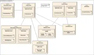 A deployment diagram in the Unified Modeling Language models the physical deployment of artifacts on nodes.[1] To describe a web site, for example, a deployment diagram would show what hardware components ("nodes") exist (e.g., a web server, an application server, and a database server), what software components ("artifacts") run on each node (e.g., web application, database), and how the different pieces are connected (e.g. JDBC, REST, RMI).