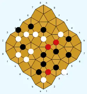 The Diamond gameboard consists of interlocking squares and triangles. White and Black each control 12 game pieces of their own color. Neutral pieces (red-colored in the diagrams) enter the game via captures. The pieces are played on the line intersections (called points, as in Go). White and black (but not red) pieces can move along straight lines to adjacent unoccupied points. A player wins by being the first to occupy all four corners (points) of a board square with their pieces.[1]