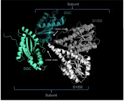 Weak sequence similarity and pronounced secondary structure similarity between GGDEF domains and the catalytic domains of adenylate cyclases (AC) have led to the hypothesis that DGCs and ACs share a similar fold.[5] This was verified with the resolution of the crystal structure of the DGC PleD from Caulobacter crescentus in complex with c-di-GMP.[4] As shown in the figure, active PleD, shown as a dimer, is composed of the catalytic DCG domain (labeled DGC) and two CheY-like receiver domains (labeled D1/D2). The DGC domain of each subunit is linked to the two CheY-like domains by a flexible peptide linkage chain.[4] The DCG domain closely resembles the domain of the AC catalytic core which consists of a five-stranded β-sheet surrounded by helices.