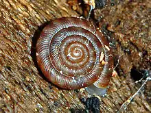 Discus rotundatus, common name rotund disc, is a species of small, air-breathing, land snail, a terrestrial pulmonate gastropod mollusk in the family Discidae, the disk snails.
