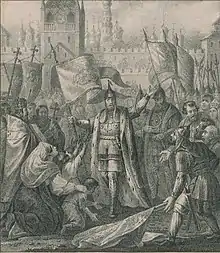 Dmitry Mikhaylovich Pozharsky (Russian: Дми́трий Миха́йлович Пожа́рский, IPA: [ˈdmʲitrʲɪj mʲɪˈxajləvʲɪtɕ pɐˈʐarskʲɪj]; 17 October 1577 – 30 April 1642) was a Russian prince known for his military leadership during the Polish–Muscovite War from 1611 to 1612. Pozharsky formed the Second Volunteer Army with Kuzma Minin in Nizhny Novgorod against the Polish–Lithuanian Commonwealth's occupation of Russia during the Time of Troubles, resulting in Polish withdrawal after Russian victory at the Battle of Moscow in 1612.[1] Pozharsky received the unprecedented title of Saviour of the Fatherland from Mikhail I of Russia, becoming a folk hero in Russian culture and honored in the Monument to Minin and Pozharsky in Moscow's Red Square.[2]