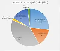 In 2011 there were 161 residents in the two parishes that were between the ages of 16 and 74 and in employment.[1] The occupations of the people usually resident at the time of the 2011 census between the ages of 16 and 74 are shown in the pie chart for 2011. The largest population percentage is Professional Occupations category with 23%. The percentage of Skilled Trades Occupations is well above the average for England of 11.4% compared to 17.4% in Docker.[1] Docker is in the countryside so this is due to the thriving agricultural industry in the area. As a result, higher qualifications may be unnecessary for the industry in Docker.