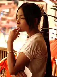 Women in Cambodia, due to the influence of the dominant Khmer culture, are traditionally expected to be modest and soft-spoken. They are to be well-mannered,[3] industrious,[4] and hold a sense of belonging to the household. It is expected that they act as the family's caregivers and caretakers,[3] financial administrators,[4] and serve as the "preserver of the home". As financial administrators, women can be identified as having household authority at the familial level.[5] Khmer women are expected to maintain virginity until marriage, become faithful wives,[3] and act as advisors to their husbands.[4] Women in Cambodia have also be known as “light” walkers-- "light" walking and refinement of the Khmer women is further described as being "quiet in […] movements that one cannot hear the sound of their silk skirt rustling".[4]