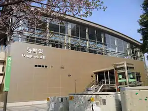 Dongbaek Station (Korean: 동백역; Hanja: 東栢驛) is a station of the Everline in Jung-dong, Giheung-gu, Yongin, South Korea.
