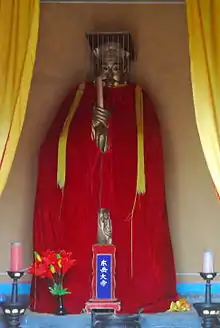 Emperor Dongyue (or Dongyue Dadi Chinese: 東嶽大帝; lit. 'The Great Emperor of the Eastern Peak') is a Daoist deity of the sacred mountain Mount Tai and judges what realm of Saṃsāra a person will be reborn in.[1] He is also believed to be the leader of a large bureaucratic celestial ministry overseeing the maintenance of the Book of Life (生死簿), a register of the due dates on which each and every human soul must be summoned before the Judges of Hell for judgement.[2] Dongyue Dadi is also considered significant in Chinese Buddhism.[3] He is the personification of Cangdi as the "Great Deity of the Eastern Peak" (东岳大帝), which is Mount Tai. As the incarnation of Mount Tai, he is the holy messenger of communication between heaven and the world, and the patron saint of the emperors of all dynasties who was ordered by the sky to govern the world.[4]