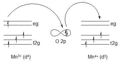 If O gives up its spin-up electron to Mn4+, its vacant orbital can then be filled by an electron from Mn3+. At the end of the process, an electron has moved between the neighboring metal ions, retaining its spin. The double-exchange predicts that this electron movement from one species to another will be facilitated more easily if the electrons do not have to change spin direction in order to conform with Hund's rules when on the accepting species. The ability to hop (to delocalize) reduces the kinetic energy. Hence the overall energy saving can lead to ferromagnetic alignment of neighboring ions.