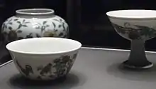 There was a certain revival of the style in the Wanli period, and a larger one under the Yongzheng Emperor (1723–1735) of the Qing dynasty.[20] Pieces were occasionally produced thereafter, in particular of the chicken cups and stem cups with grapes, two of the most admired designs of the Chenghua period.[21] The discovery and examination by the archaeologist Liu Xinyuan (劉新園) and his team of a heap of discarded broken porcelains of the Chenghua period at the imperial kiln site at Jingdezhen "revolutionised scholars' knowledge of patterns and forms of doucai".[22]