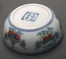 The rare Chenghua pieces are small, but of very high quality. They are thin-walled porcelain of the standard Jingdezhen porcelain of the time. Decoration is restrained, with relatively large parts of the surfaces left as white background; often bowls are only decorated on their outside. The colours in Chenghua pieces are the underglaze blue, and overglaze red, green, yellow and an aubergine (eggplant) purple-brown. This last is transparent and can be used over the other colours, requiring yet another firing.[26] Most pieces carry a six-character reign mark, and the Chenghua mark became "the most widely imitated of all marks" in later periods.[27]