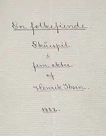 An Enemy of the People (original Norwegian title: En folkefiende), an 1882 play by Norwegian playwright Henrik Ibsen, followed his previous play, Ghosts, which criticized the hypocrisy of his society's moral code. That response included accusations of both Ghosts and its author being "scandalous," "degenerate," and "immoral."[1] In An Enemy of the People, a man dares to expose an unpalatable truth publicly and is punished for it.