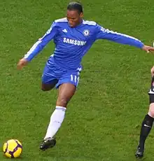 Didier Yves Drogba Tébily (French pronunciation: [didje iv dʁɔɡba tebili]; born 11 March 1978) is an Ivorian former professional footballer who played as a striker.[5] He is the all-time top scorer and former captain of the Ivory Coast national team. He is best known for his career at Chelsea, for whom he has scored more goals than any other foreign player and is currently the club's fourth highest goal scorer of all time. Drogba was named Chelsea's greatest ever player in a poll of 20,000 fans conducted by Chelsea FC Magazine in 2012, and he was also named in the Chelsea team of the 2010–2020 decade by Chelsea's fans in 2020.[6][7] Regarded as one of the greatest African players of all time, he was noted for his physical strength, speed, ability in the air, powerful and accurate strikes, and ball retention. Drogba was named African Footballer of the Year twice, winning the award in 2006 and 2009.
