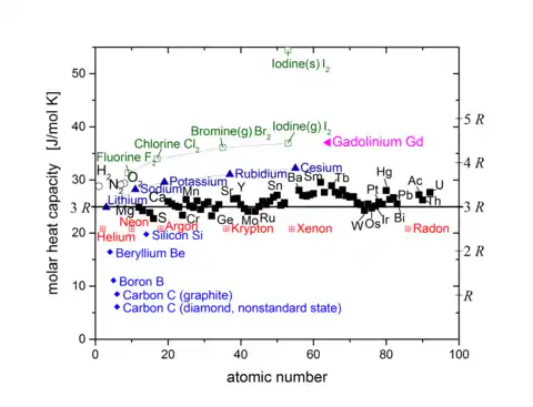 The molar heat capacity plotted of most elements at 25°C plotted as a function of atomic number. The value of bromine is for the gaseous state. For iodine, a value for the gas and one for the solid is shown.
