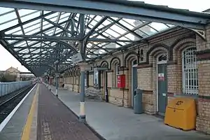 The ticket office and modern waiting area are located at road level, whereas the station proper is beneath this at track level. The two sections are connected by a Victorian covered walkway, and by a 21st-century lift for disabled access. The station is noted for its fine iron, glass, and polychromic brickwork. It has been said to be the finest station on the Dublin-Belfast line.[2]