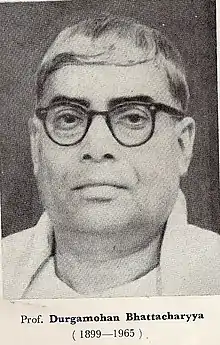 After completing his studies in the University, Durgamohan decided to take up the educational line as his field of activities. Having served as a Professor of Sanskrit in the Narasinha Dutt College of Howrah for some time, he joined the Scottish Church College as a professor of Sanskrit and Bengali and eventually became the head of the department of Sanskrit in the early thirties.[1] In 1952 he was inducted in the West Bengal Senior Educational Service as Professor of Vedic Language, Literature and Culture in the Postgraduate Training and Research Department of the Sanskrit College, which position he occupied till the date of his death.