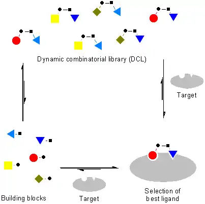 Dynamic combinatorial chemistry (DCC); also known as constitutional dynamic chemistry (CDC) is a method to the generation of new molecules formed by reversible reaction of simple building blocks under thermodynamic control.[3][4] The library of these reversibly interconverting building blocks is called a dynamic combinatorial library (DCL).[5][6] All constituents in a DCL are in equilibrium, and their distribution is determined by their thermodynamic stability within the DCL. The interconversion of these building blocks may involve covalent or non-covalent interactions. When a DCL is exposed to an external influence (such as proteins or nucleic acids), the equilibrium shifts and those components that interact with the external influence are stabilised and amplified, allowing more of the active compound to be formed.