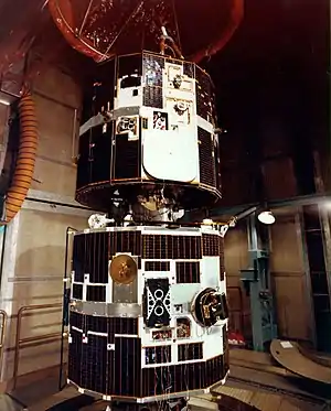 ![]() Dynamics Explorer 1 (Explorer 62) in the bottom and Dynamics Explorer 2 (Explorer 63) in the top | |
