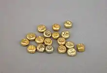 Most gold coins of 9th and early 10th century Java are stamped with the character ta in nagari script on one side, an abbreviation of tahil. The same character remained on coins until the Kediri period in the 12th-century.[1] Gold coins were usually made in the shape of cubes, carefully crafted and very uniform in size and gold content.