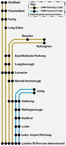 As of December 2023, East Midlands Railway's regular off-peak services Monday-Friday include:[33]
