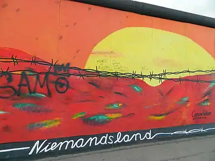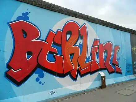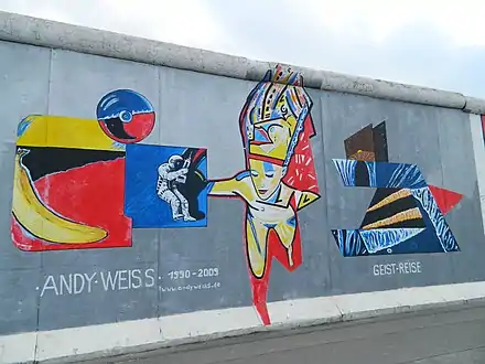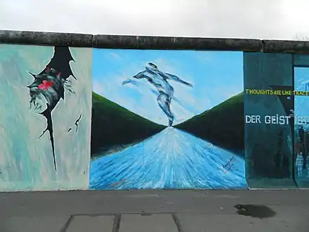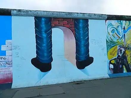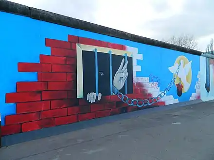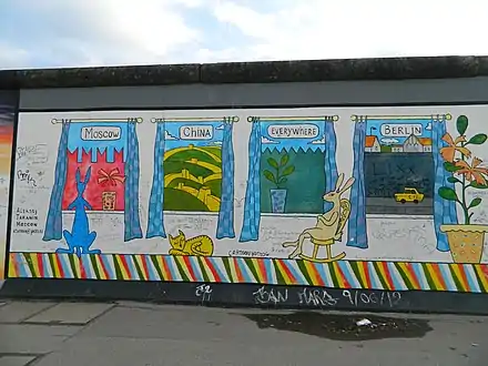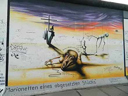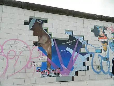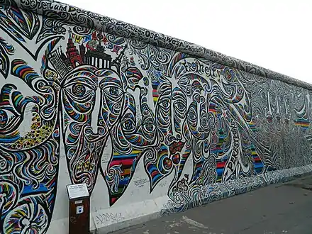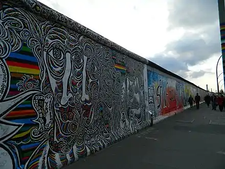 The East Side Gallery (German: East-Side-Gallery) memorial in Berlin-Friedrichshain is a permanent open-air gallery on the longest surviving section of the Berlin Wall in Mühlenstraße between the Berlin Ostbahnhof and the Oberbaumbrücke along the Spree. It consists of a series of murals painted directly on a 1,316 m (4,318 ft) long remnant of the Berlin Wall,[1] located near the centre of Berlin, on Mühlenstraße in Friedrichshain-Kreuzberg.
