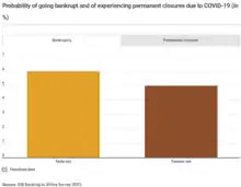 In 2023, East Africa has the largest crowding out pressures, whereas North Africa has the lowest.[53] In a recent report, female-led businesses were found more likely to invest in innovation, export goods and services, and provide employee training. Over half of the banks studied in this report indicated a lower percentage of non-performing loans among enterprises run by women than males.[54][55][56] Female-led firms also had lower rates of bankruptcy and were less likely to be affected by the COVID-19 pandemic.[57][58] 65% of banks in Africa were found to have a gender focused strategy in place.[54]