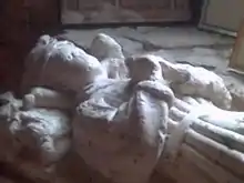 The location of Edward's burial is unknown. A mutilated white alabaster cenotaph ("empty tomb")[14] in the Church of St Helen and the Holy Cross at Sheriff Hutton, with an effigy of a child, was long believed to represent Edward of Middleham, but is now thought to be an earlier work depicting one of the Neville family.[15]