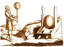 German physicist Otto von Guericke beside his electrical generator while conducting an experiment.