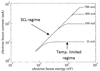 TC electron emission will occur in one of two different regimes: temperature or space charge limited current flow. For temperature limited flow every electron that obtains enough energy to escape from the cathode surface is emitted, assuming the acceleration potential of the electron gun is large enough. In this case, the emission current is regulated by the thermionic emission process, given by the Richardson Dushman equation. In SCL electron current flow there are so many electrons emitted from the cathode that not all of them are accelerated enough by the electron gun to escape the space charge. In this case, the electron gun acceleration potential limits the emission current. The below chart displays the temperature limiting currents and SCL effects. As the beam energy of the electrons is increased, the total escaping electrons can be seen to increase. The curves that become horizontal are temperature limited cases.