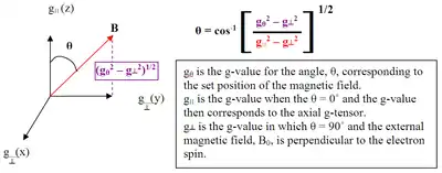 The traditional convention of magnetic resonance envisions the paramagnets aligning with the external magnetic field; however, in practice it is simpler to treat the paramagnets as fixed and the external magnetic field as a vector. Specifying positional relationships requires three separate but related pieces of information: an origin, the distance from said origin, and a direction of that distance.[13] The origin, for purposes of this explanation, can be thought of as the position of a molecule's localized unpaired electron. To determine the direction to the spin active nucleus from the localized unpaired electron (remember: unpaired electrons are, themselves, spin active) one employs the principle of magnetic angle selection. The exact value of θ is calculated as follows to the right: