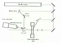 - ↑ Josefowicz, J.; Hallett, F. R. (1975-03-01). "Homodyne Electrophoretic Light Scattering of Polystyrene Spheres by Laser Cross-Beam Intensity Correlation". Applied Optics. The Optical Society. 14 (3): 740. doi:10.1364/ao.14.000740. ISSN 0003-6935.