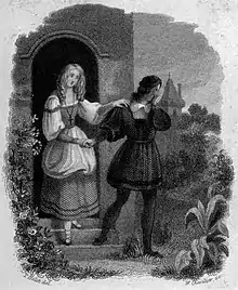 ![]() Victor departs from Elizabeth to study in Ingolstadt. Engraving by Theodor von Holst for the 1831 edition. | |