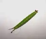 Race undularis "Elongate, fusiform, setose; green with longitudinal dorsal and lateral yellow lines, and a subdorsal row of yellow elongated spots, which are centred with red and posteriorly edged with blue; head brownish, armed with two erect brownish setose processes; anal segment also with two red slender hindward-projecting processes."[1]