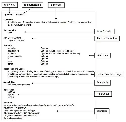 The EAD standard's XML schema specifies the elements to be used to describe a manuscript collection as well as the arrangement of those elements (for example, which elements are required, or which are permitted inside which other elements). The EAD tag set has 146 elements and is used both to describe a collection as a whole, and also to encode a detailed multi-level inventory of the collection. Many EAD elements have been, or can be, mapped to content standards (such as DACS and ISAD(G)) and other structural standards (such as MARC or Dublin Core), increasing the flexibility and interoperability of the data.[24]