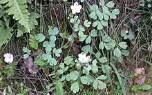 Enemion occidentale (syn. Isopyrum occidentale) is a species of flowering plant in the buttercup family known by the common name western false rue anemone. It is found in California and rarely in Oregon where it is a resident of forest, woodland, and chaparral habitats in many of the mountain ranges. This is a small perennial herb producing one or more erect, unbranched stems growing to maximum heights near 25 centimeters. Leaves appear toward the top of the smooth, naked stems. Each green cloverlike leaf is divided into usually three irregular lobes. The solitary flowers are petite with white to very light lavender petallike sepals and no petals. At the center are white stamens with yellow anthers and white styles with yellow stigmas.