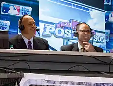 Johnson (right) in the broadcast booth with Cal Ripken Jr. during the 2012 American League Division Series