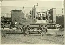 Ernst Wiener Co., New York built for instance a gasoline locomotive designed to haul ten loaded cars (tonnage 25), at a speed of eight to twelve miles an hour (13 to 20 km/h). It had a four cylinder, water cooled, four-cycle, gasoline engine, with cylinders cast in pairs and standing vertically. Ignition was provided by the storage battery and magnetic type, arranged for two sets of spark plugs. A radiator of the automobile type was at the front of the locomotive.[1][2]