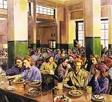 In April 1940, Gabain was commissioned by the War Artists' Advisory Committee, WAAC, to produce four lithographs of Women's Voluntary Services members and four on the subject of children being evacuated from London and other cities. Gabain actually offered WAAC thirteen lithographs for this commission but they only accepted the original eight commissioned.[12] WAAC published these as two sets of lithographs, Children in Wartime with five images and Women's Work in the War other than the Services, which had six images.[13] In total WAAC acquired 38 works by Gabain during the War.[14] For these commissions Gabain, although often in poor health, travelled all over Britain. She went to the Scottish Highlands to record the work of women lumberjacks, known as "lumberjills", at a Women's Land Army camp in Banffshire and to Devon to depict children evacuated there from London.[1] Throughout the War, Gabain recorded women working in what, in peacetime, had been traditionally male crafts and trades. As well as women salvage workers, factory workers, ARP wardens and air raid workers, Gabain produced a portrait of Captain Pauline Gower of the Air Transport Auxiliary.[15] In 1945, she produced a series of portraits that included Barbara Ward and Caroline Haslett.[16][17]