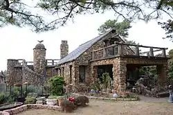 The Evelyn Gill Walker House is a historic house at 18 South Spruce Street in Paris, Arkansas. Built by mason Tolbert E. Gill over a several-year period beginning in 1938, it is a distinctive example of Gill's Rustic style, with a stone veneer exterior and decorative components. It has a 1+1⁄2-story gabled main section, with a flat-roof porch in front, and a flat-roof ell in the rear. The ell features a turret with a bell-cast top, with a surrounding curved staircase leading to an open deck on the ell's roof.[2]