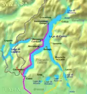 Audisio and Lampredi left Milan for Dongo early on the morning of 28 April 1945 to carry out the orders Audisio had been given by Longo.[35][36] On arrival in Dongo, they met Bellini delle Stelle, who was the local partisan commander, to arrange for Mussolini to be handed over to them.[35][36] Audisio used the nom de guerre of "Colonnello Valerio" during his mission.[35][37] In the afternoon, he, with other partisans, including Aldo Lampredi and Michele Moretti, drove to the De Maria family's farmhouse to collect Mussolini and Petacci.[38][39] After they were picked up, they drove 20 kilometres (12 mi) south to the village of Giulino di Mezzegra.[40] The vehicle pulled up at the entrance of the Villa Belmonte on a narrow road known as via XXIV maggio and Mussolini and Petacci were told to get out and stand by the villa's wall.[35][40][41] Audisio then shot them at 4:10 p.m. with a submachine gun borrowed from Moretti, his own gun having jammed.[35][39][42] There were differences in Lampredi's account and that of Audisio. Audisio presented Mussolini as acting in a cowardly manner immediately prior to his death whereas Lampredi did not. Audisio said he read out a sentence of death, whereas Lampredi omitted this. Lampredi said that Mussolini's last words were "aim at my heart". In Audisio's account, Mussolini said nothing immediately prior to or during the execution.[42][43]