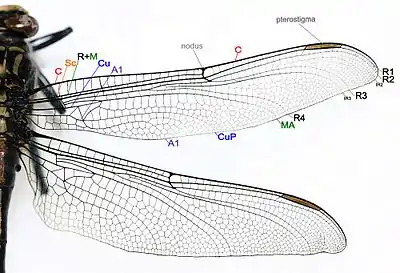 A nodus is formed where the subcostal vein meets the leading edge of the wing. The dark pterostigma is carried near the wing tip.