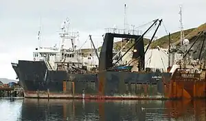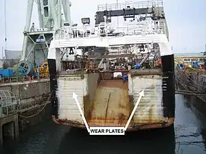 ![]() Wear plates fitted over stern of Alaska Ranger, shown in 2005. Stern ramp in the center allowed nets to be launched into the sea and then hauled on board with their catch. | |