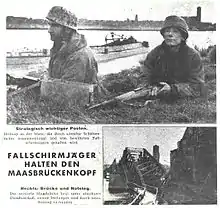 ![]() German propaganda leaflet stating that paratroopers (KG Hübner and KG Müller) are holding a bridgehead west of the Meuse (Maas) near Roermond. The Germans were driven off the westbank in November 1944. | |