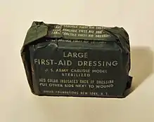 This dressing, already developed in 1904, and subsequently introduced in 1906, was supplied to the troops in a sealed brass casing, to protect the bandage inside against gas attacks, and to also ensure that it remained sterile. An improved version was introduced in 1940, designated First-Aid Packet, U.S. Government – Carlisle Model to tackle the problem of front line wounds and casualties. The Carlisle Bandage underwent a number of changes in its development during WW2. In summer of 1940, U.S. Army, Carlisle Model Small First-Aid Dressing made its appearance. It was contained in a waxed rectangular tuck-end carton, printed with the required markings. Considerable difficulty was encountered in the procurement of the first aid packet. During the Army expansion of 1940, approximately eight million were required for initial stock of equipment In the middle of 1941, the Medical Department decided to amend their specifications, and placed purchase orders for containers made out of tin (instead of brass). The new version was introduced by fall of 1941, together with the very first Sulfanilamide Shaker Envelopes. During the early part of 1943, a plastic container (called Tenite) was developed and put into production, but under field conditions the package warped and broke open. In the course of 1943 the items were wrapped in laminated paper, reinforced with aluminum or lead foil, and covered internally with either pliofilm, cellophane, or polyvinyl butyral and placed inside an appropriate waxed cardboard shell. The small Carlisle model first aid dressing measured approximately 4"X2"X1". When opened, its 1/2"-thick pad measured 7"X4" and had two long gauze tietapes.[2] The Large Carlisle model first aid dressing measured approximately 11 3/4"square. Brief instructions were stenciled on the bandage in red ink. Most packaging included the word "Sterile" and the directions "Red color indicates back of dressing – put other side next to wound." If a dressing was "camouflaged" it was olive drab in color. Detailed explanations and photos concerning the application of dressing to wound were included in a printed manuals for US soldiers.[3][4][5]