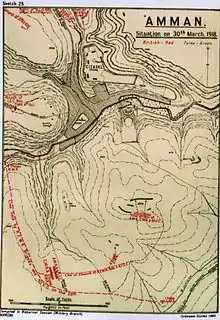 Chaytor's Force held a line from the railway near Quseir across the Ain es Sir track 2 km (1 mi) west of Amman to 2 km (1 mi) northwest of the city.[64] During the night the German and Ottoman line was strengthened and soon after daybreak on 28 March, German and Ottoman guns opened fired on the Anzac Mounted Division, whose only reply was the Imperial Camel Corps Brigade's four 12-pounder mountain guns of the Hong Kong and Singapore Mountain Battery. British reinforcements on their way from Es Salt, with two or three batteries of mountain guns began to arrive at 10:30 when the leading battalion was immediately put into a gap in the line, on the left of the Imperial Camel Corps Brigade, between them and the 2nd Light Horse Brigade.[29][30]