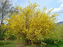Forsythia are early spring-flowering shrubs with yellow blooms,[20] often seen in private gardens, public landscaping works and parks—notably during Eastertide), when some of the plants are nicknamed Easter Tree in honor of the coming spring.[21] Two species/hybrids are commonly cultivated for ornamental use, Forsythia × intermedia and F. suspensa. They are grown in several climates and gardening zones, prized for being tough and reliable perennial plants. F. × intermedia is the more commonly grown, smaller plant and has an upright habit with vivid flowers. F. suspensa is a large to very large shrub with paler blossoms, and can be grown in a weeping shape on banks. Many named garden cultivars can also be found. Budding Forsythia cuttings are frequently brought indoors, for their opening blooms, in the early spring.[7]