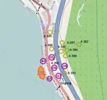 The Fort de Chillon lies directly adjacent to the Château de Chillon, a major tourist attraction. The site has been fortified since at least the 12th century. The Fort de Chillon is a mixed infantry-artillery fort, located almost entirely underground in the steep slope rising to Veytaux above the rail line.[1][2] The location is spanned by the Viaduc de Chillon. Built at the opening of the Second World War (1941),[3] it was armed with a mixture of 75mm guns and 90mm anti-tank guns.[4] Initial work was completed in 1942. The fort was designated A390 in the Swiss fortification nomenclature.[2] The ensemble included permanent and rapidly deployable anti-tank obstacles, designed to stall or trap an enemy while the fort's weapons fired on them.[5]