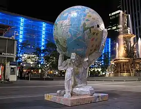 To celebrate the 40th anniversary of Earth Day 2010, the square featured "EcoSculpt 2010", an exhibit of sustainable art. The exhibit included "Atlas Recycled" by Tom Tsuchiya, a sculpture made of used atlases that doubled as a recycling receptacle for plastic bottles and aluminum cans.[5]