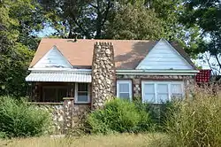 The Fred Graham House is a historic house on United States Route 62 in Hardy, Arkansas. It is a vernacular Tudor Revival structure, 1+1⁄2 stories in height, built out of uncoursed native fieldstone finished with beaded mortar. The roof is side gabled, with two front-facing cross gables. The south-facing front facade has a stone chimney with brick trim positioned just west of center between the cross gables, and a raised porch to the west of that. Built c. 1931, it is a fine local example of vernacular Tudor Revival architecture.[2]
